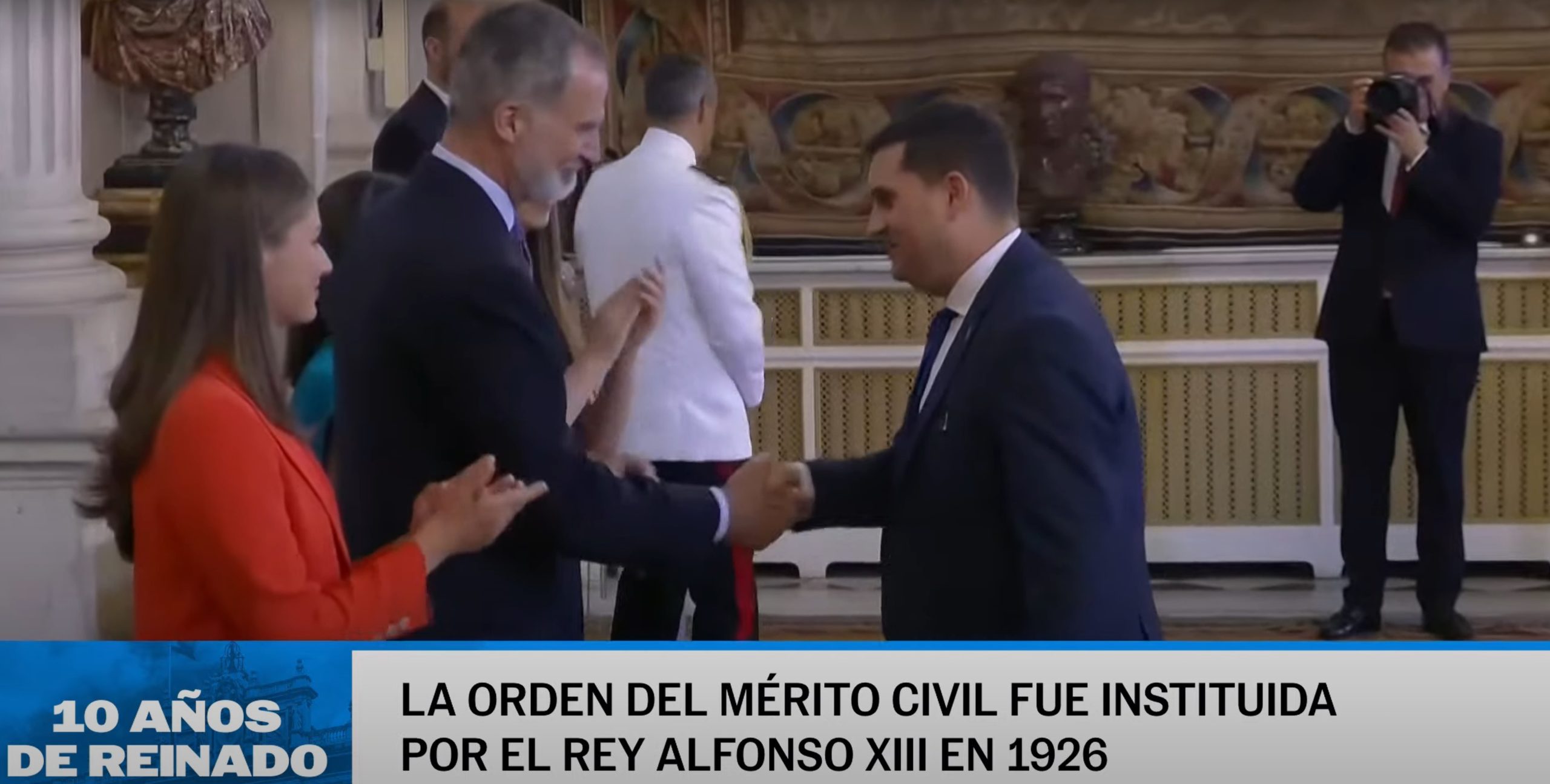 El pasado día 19 de junio, en el Palacio Real de Madrid, Sus Majestades los Reyes acompañados por Sus Altezas Reales la Princesa de Asturias y la Infanta Doña Sofía, con ocasión del X aniversario de la proclamación de Su Majestad el Rey, realizaron la imposición de las condecoraciones de la Orden del Mérito Civil, como reconocimiento de la Corona a quienes desarrollan su vida y labor profesional ordinaria de manera ejemplar, al servicio de la sociedad.